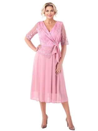 Wieczorowa sukienka z paskiem, kreacja z koronkowymi wstawkami 31892