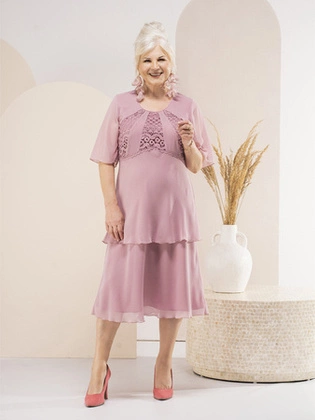 Luźna sukienka z szyfonu, pudrowa kreacja zdobiona przy dekolcie 22118.