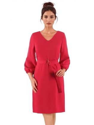 Sukienka damska midi, amarantowa, prosta sukienka koktajlowa z tkaniny, pasek, dekolt V, bufiaste rękawy 38981