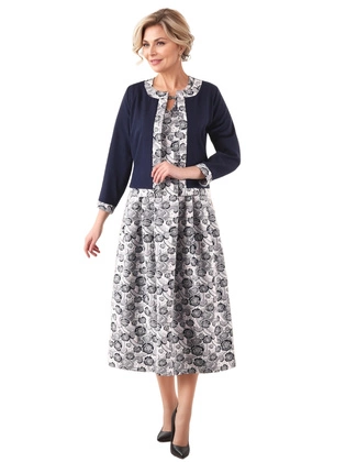 Komplet damski na wesele i komunię – elegancka sukienka midi w kwiaty z żakardowej tkaniny i prosty żakiet 39881