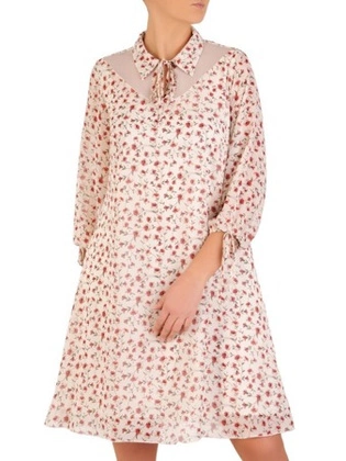 Luźna sukienka z szyfonu, pudrowa kreacja zdobiona przy dekolcie 22118.