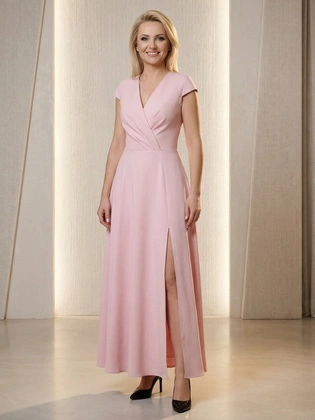 Suknia wieczorowa pudrowy róż – długa rozkloszowana kreacja z kopertowym dekoltem i rozcięciem na wesele i karnawał 19923