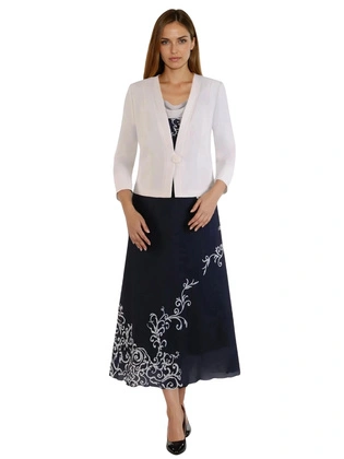Sukienka z ozdobnymi, szyfonowymi rękawami 14271, granatowa kreacja wieczorowa.