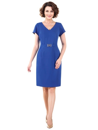 Sukienka wyszczuplająca talię, chabrowa kreacja kopertowa 25114