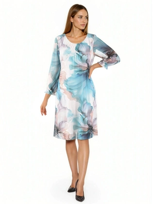 Turkusowa sukienka trapezowa z tiulem – zwiewna sukienka midi z rękawem 3/4 i artystycznym wzorem, idealna na wesele 40395