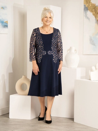 Kostium damski, granatowa sukienka z koronkowym, połyskującym żakietem 34550