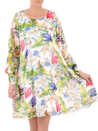Szyfonowa sukienka w kwiaty, kreacja z ozdobnymi rękawami 25352