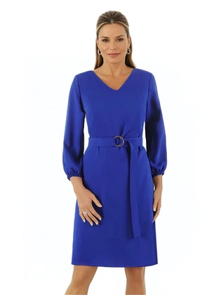 Sukienka damska midi, chabrowa, prosta sukienka koktajlowa z tkaniny, pasek, dekolt V, bufiaste rękawy 38982