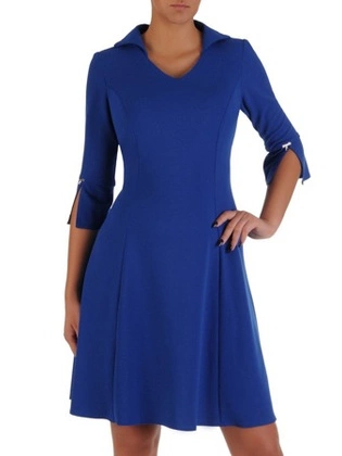 Rozkloszowana sukienka z modnym kołnierzykiem 18191, chabrowa kreacja wizytowa.