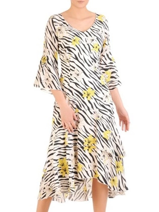 Luźna sukienka z falbanami 18208, jesienna kreacja w modny wzór.
