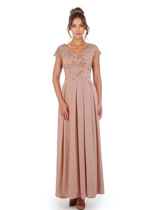 Modna sukienka wizytowa w pudrowym różu – trapezowa sukienka midi z fantazyjną falbaną i krótkim rękawem 40096