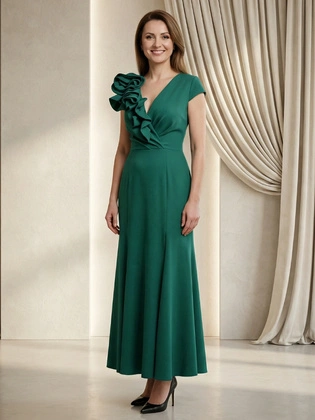Suknia wieczorowa maxi z falbaną – zielona, stylowa kreacja na karnawał, studniówkę i wesele w wyszczuplającym fasonie 39008