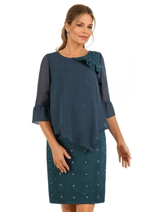 Granatowa sukienka z ozdobną narzutką i połyskującą aplikacją 37143