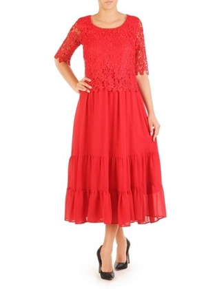 Luźna sukienka z szyfonu, czerwona kreacja z koronkowym topem 30211