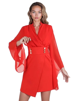 Kopertowa sukienka wyszczuplająca, kreacja z ozdobnymi marszczeniami 32064