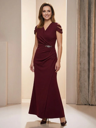 Sukienka wyszczuplająca na wesele i sylwestra – bordowa maxi syrenka z kopertowym dekoltem i zdobieniami 40715