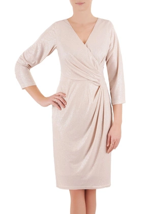 Kopertowa sukienka wyszczuplająca, kreacja z ozdobnymi marszczeniami 34189