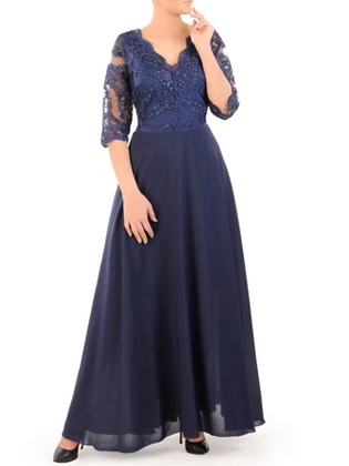 Sukienka koktajlowa maksi, granatowa kreacja z koronkową górą 30726