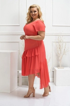 Koralowa sukienka w eleganckim fasonie maskującym niedoskonałości 29248
