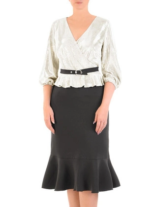 Efektowana sukienka z baskinką, kreacja z połyskującą górą 35006
