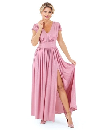 Pudrowa sukienka na wesele, lekka kreacja z wydłużonym tyłem 21355