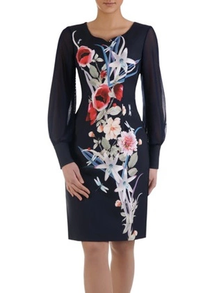 Elegancka sukienka z kwiatowym nadrukiem 15010, kreacja z tiulowymi rękawami.