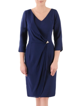 Granatowa sukienka damska na wesele z eleganckim drapowaniem i ozdobną broszką 38859