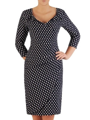 Kopertowa sukienka z zakładkami, modna kreacja w grochy 23271