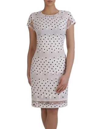 Wiosenna sukienka w groszki 16597, kreacja z ozdobnym żabotem.