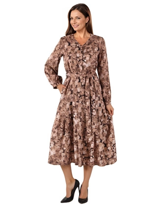 Brązowa sukienka trapezowa z wiskozy – elegancka sukienka wizytowa z paskiem i ozdobnym rozcięciem na rękawie 40698