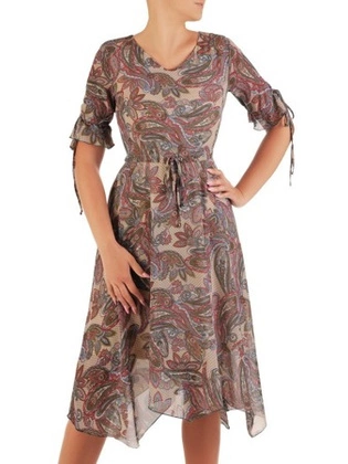Sukienka z tkaniny, rozkloszowana kreacja z ozdobnym wiązaniem 25071