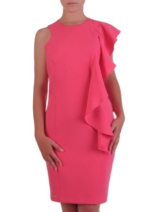 Koralowa sukienka z dekoracyjną falbaną 16845, nowoczesna kreacja wizytowa