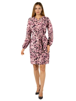 Sukienka wizytowa z oryginalnym printem – fioletowo-różowa midi z bufkami i dekoltem łódka, idealna na wyjście 40702