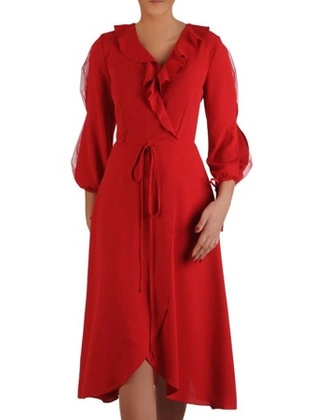 Zwiewna sukienka o kopertowym kroju, wieczorowa kreacja z żabotem 19198