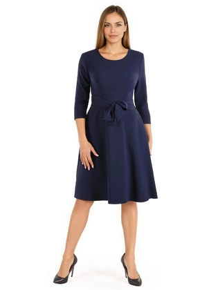 Brązowa sukienka midi z paskiem - elegancka sukienka z krótkim rękawem i dekoltem łódka 40361