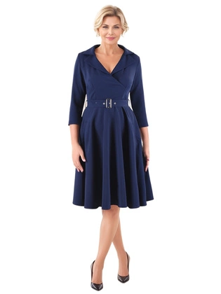 Rozkloszowana sukienka z modnym kołnierzem 14659, elegancka kreacja z paskiem.