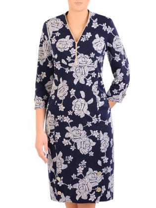 Sukienka z bufiastymi rękawami 14688, kreacja w wyszczuplający, kwiatowy wzór.