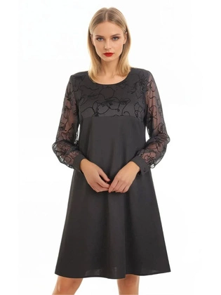 Trapezowa sukienka z ozdobnym, koronkowym karczkiem i rękawami 31910