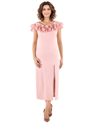 Kobieca sukienka midi na wesele i komunię – elegancki fason z ozdobnymi rękawami 39784