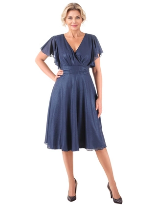 Połyskująca sukienka na wesele midi z dekoltem w serek i ozdobnym marszczeniem 39670