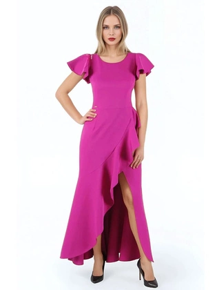 Sukienka wyjściowa, chabrowa kreacja z ozdobnymi falbanami 25109