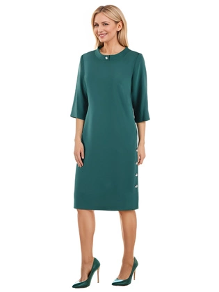 Wyszczuplająca sukienka midi beżowa – prosty fason z dzianiny z ozdobnym dekoltem i rękawem 3/4 40700