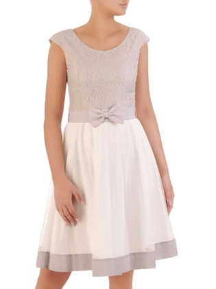 Beżowa sukienka na wesele, nowoczesna kreacja wykończona koronką 19740