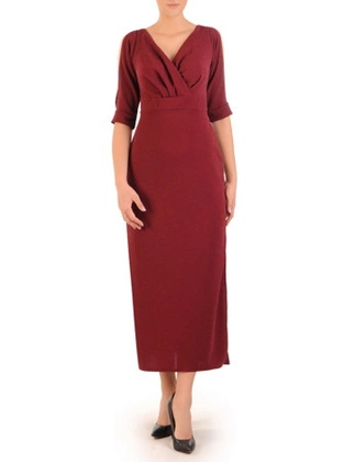 Suknia maxi z połyskującej dzianiny, kreacja z kopertowym dekoltem 31520