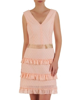 Romantyczna sukienka wykończona falbankami, elegancka kreacja z koronki 21489