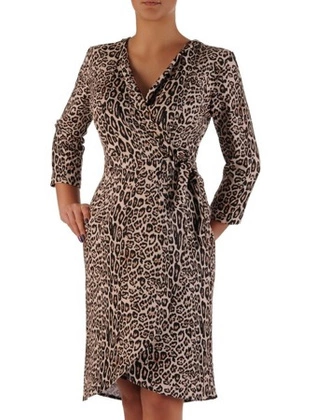 Kopertowa sukienka w modną panterkę 18622, kreacja z ozdobnym wiązaniem.