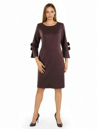 Brązowa sukienka wizytowa midi – elegancka sukienka z kwiatową aplikacją na rękawach 40970