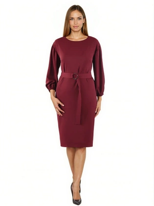 Brązowa sukienka trapezowa z wiskozy – elegancka sukienka wizytowa z paskiem i ozdobnym rozcięciem na rękawie 40698