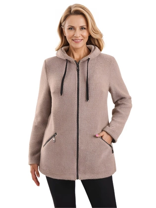 Beżowa kurtka dzianinowa z kapturem – wygodna kurtka przejściowa na zamek z kieszeniami 40266