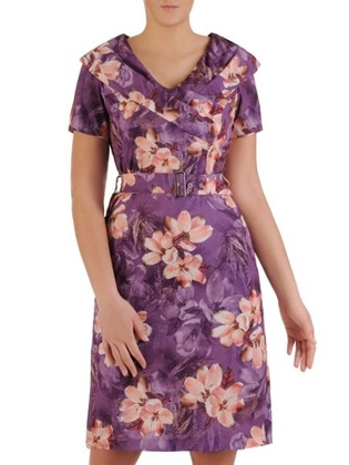 Sukienka z tkaniny, prosta kreacja w kwiaty z ozdobnym kołnierzem 24561